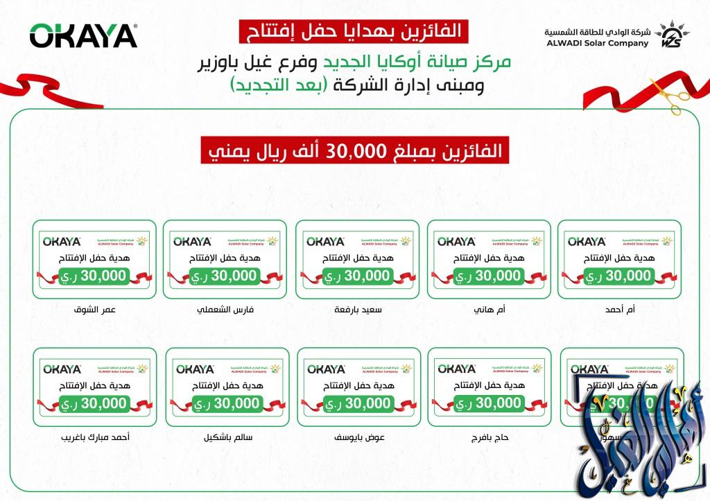 في حفل جماهيري كبير وبحضور رسمي افتتحت شركة الوادي للطاقة الشمسية (الوكيل الحصري لبطاريات ومحولات أوكايا في اليمن) عصر يوم الجمعة الموافق 20 سبتمبر 2024م مركز صيانة أوكايا وفرع غيل باوزير ومبنى إدارة الشركة بعد التجديد بحضور مدير عام مديرية غيل باوزير الأستاذ/ سالم عبدالله العطيشي باوزير والأستاذ / مروان صالح الخلاقي مدير مكتب الصناعة والتجارة بالمديرية .