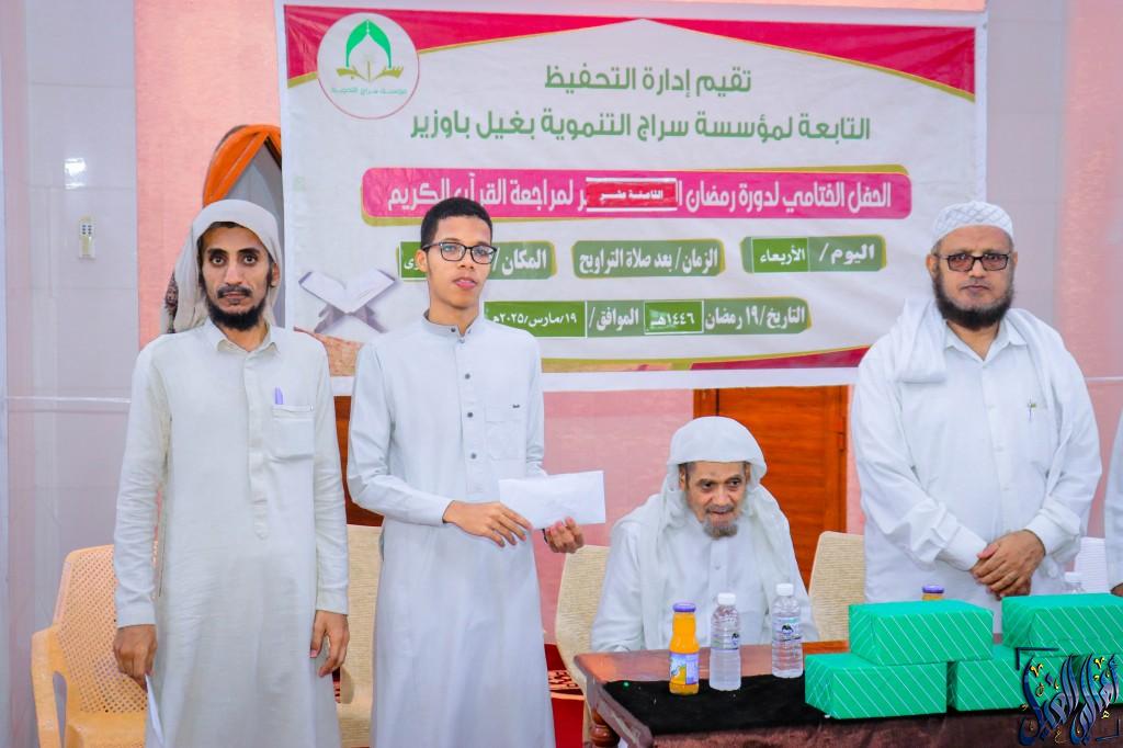 - في حفل بهيج وأجواء إيمانية رائعة ، اختتمت مساء هذا الأربعاء ١٩ رمضان ١٤٤٦هـ بجامع التقوى دورة رمضان لمراجعة القرآن الثامنة عشر المقامه بجامع ذهبان إشراف مؤسسة سراج التنموية بغيل باوزير مع تكريم الطلاب الأوائل في المسابقة القرآنية الثالثة .