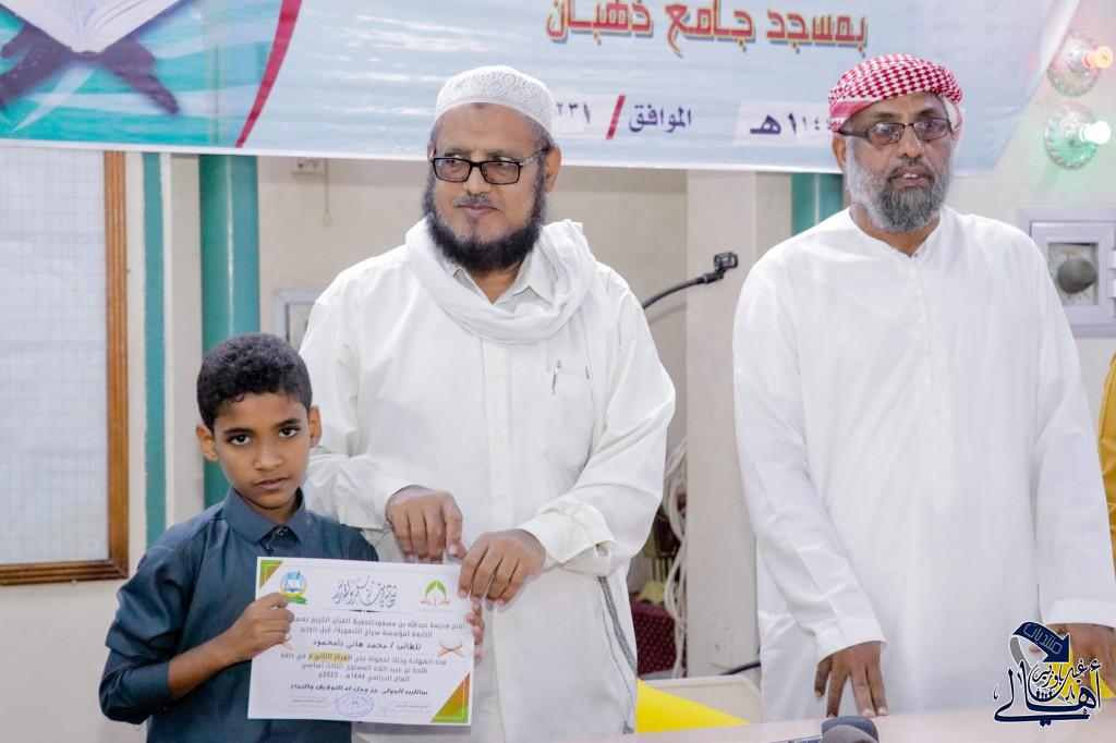 في مساء الثلاثاء تاريخ 18 / يناير /2023م أقامت إدارة مدرسة عبدالله بن مسعود رضي الله عنه لتحفيظ القرآن الكريم والعلوم الشرعية بمسجد جامع ذهبان التابعة لمؤسسة سراج التنموية الحفل الختامي التكريمي لـأوائل الحلقات بالمسجد للعام:- ه 1444-2022م ، والذي يبلغ عددها ثمان حلقات ، منها حلقتين نموذجيـة.