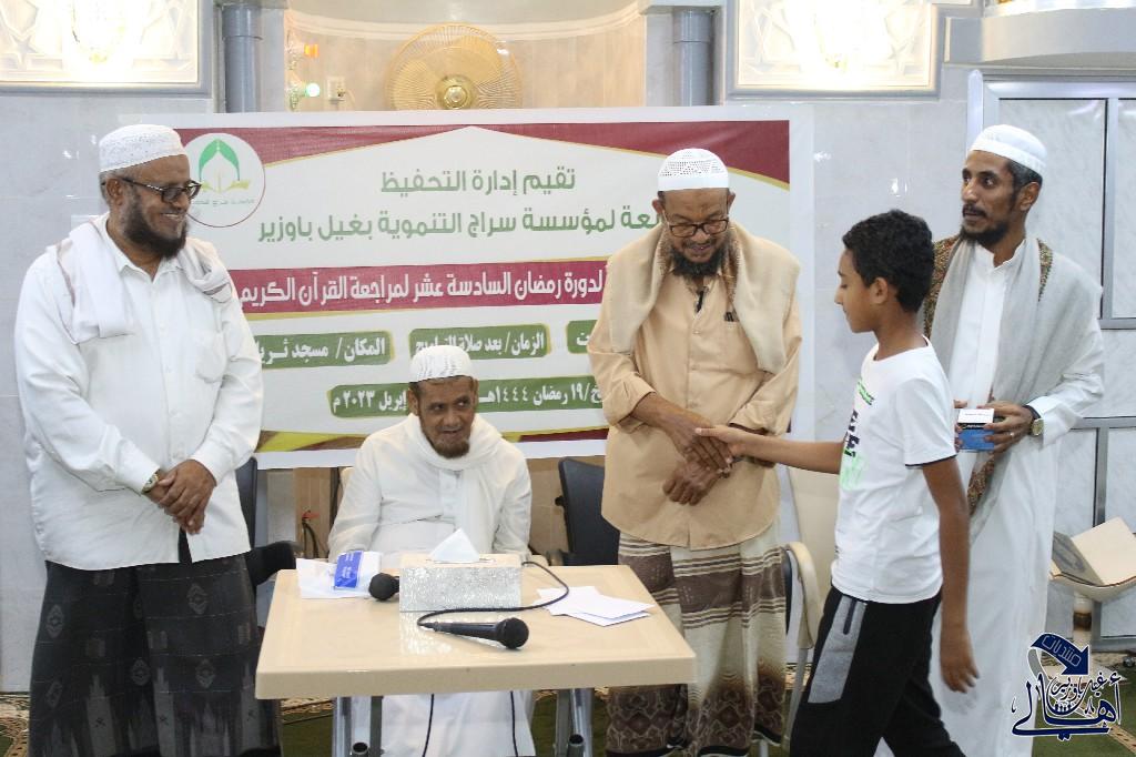 في حفل بهيج وأجواء إيمانية وروحانية تحيي الروح والجسد ، اختتمت مساء هذا الأثنين ١٩ رمضان ١٤٤٤ هـ بمسجد الثريا دورة رمضان لمراجعة القرآن السادسة عشر المقامة بمسجد ذهبان إشراف مؤسسة سراج التنموية بغيل باوزير